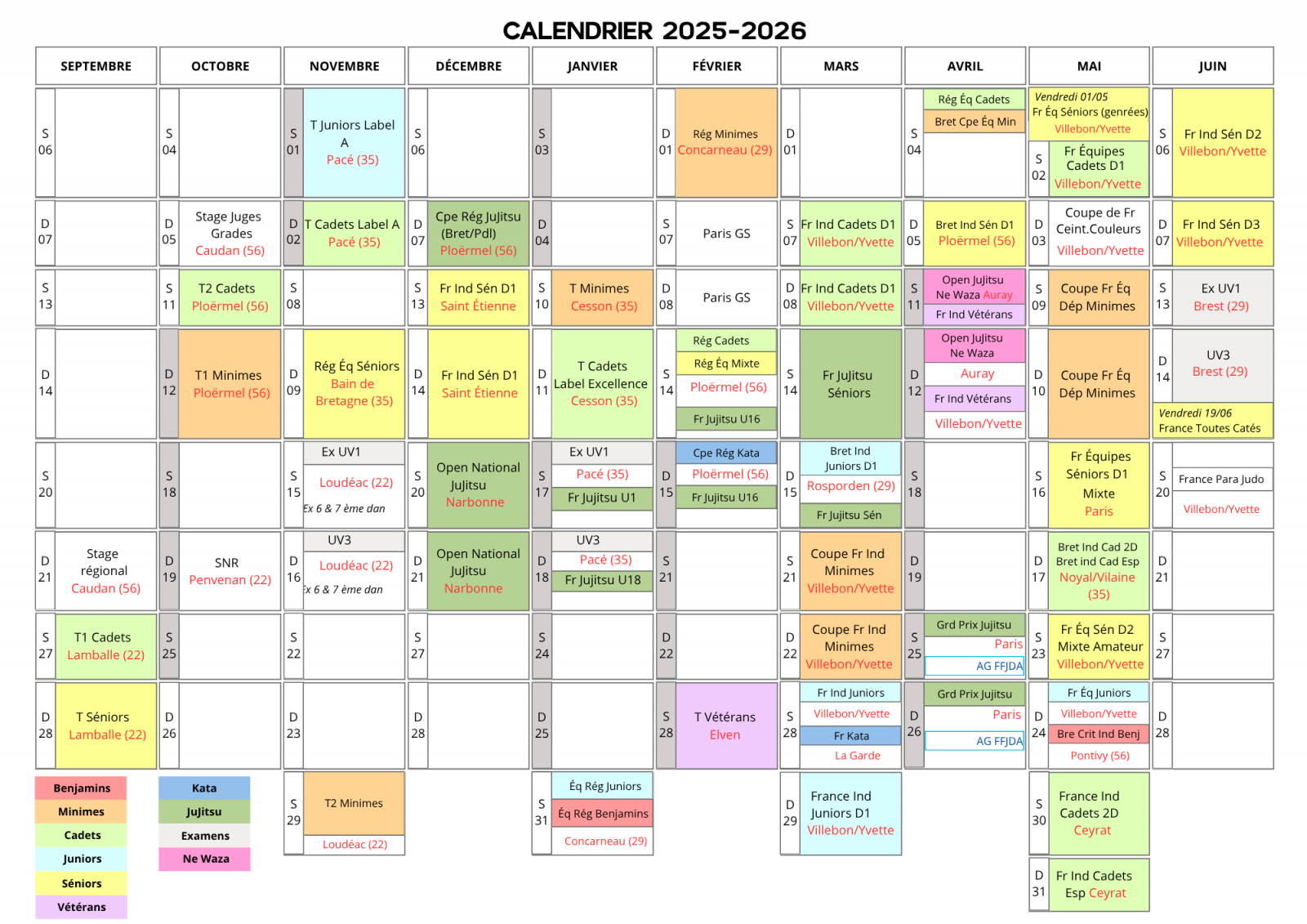 Le calendrier de la Bretagne pour la saison 2025-2026 :   à télécharger en excel